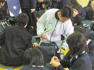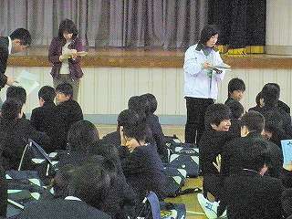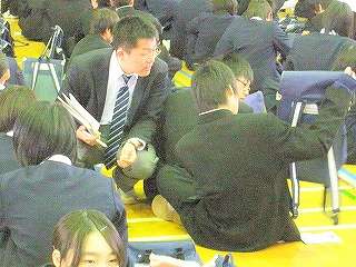 ※4月12日(月)の学年集会の様子です。担任の先生がザックや服装、頭髪点検をしました。写真撮影隊形の練習もしました。