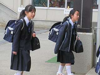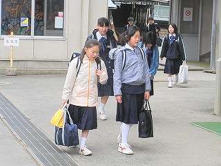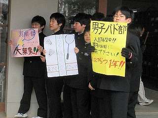 ※4月22日(木)、登校の様子です。男子バドミントン部は新入部員獲得に意欲的で、勧誘のポスターを持って挨拶運動に参加していました。入部すると、「ありがたい顧問の先生のお説教が付いてくるとか?」