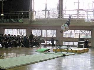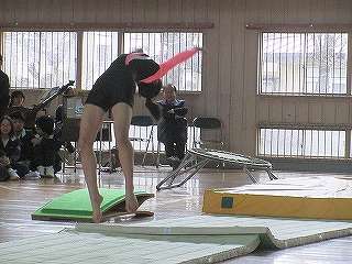 ※4月8日(木)に行われた「部活動オリエンテーション」。3年生が全面に立って新入生へ自分の部活動を紹介しました。3年生のいい表情を見ていただきたいと思います。女子体操部の発表の様子です。