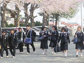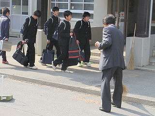 ※5月6日(木)登校の様子です。学校の綺麗に咲いた桜の様子です。しかしあと数日かも。今日の風で桜吹雪が舞い、とてもきれいです。校長先生自らほうきを持って生徒昇降口前の桜の花びらを集めていました。