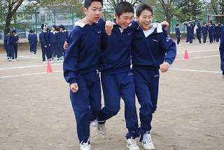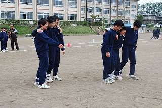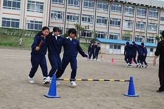 5月11日(火)、各学年で体育祭の学年練習を行いました。写真は2年生の3人4脚の練習の様子です。カラーコーンの上のバーを飛び越えるのがかなり難しそうです。