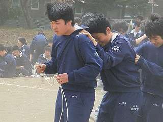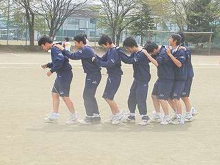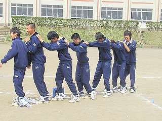 11日(火)の4校時、3年生は「ムカデリレー」の学年練習に取り組みました。今日は、ムカデリレーの距離を短くして、競争をしました。