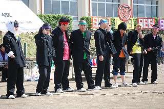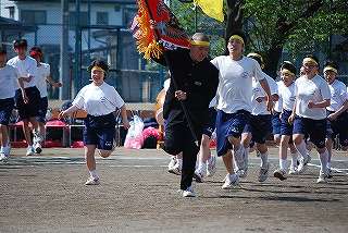 ※15日(土)体育祭「開会式」の様子です。生徒会執行部と組団長で「ヤンクミと7人のワル」。「学級のリーダーを決めるために、運動会で勝負をつけよう!」と言う筋書きで、体育祭がスタートしました。「ヤンクミ」の服は、うちの学校の「ヤンクミ」の衣装でしょうか?
