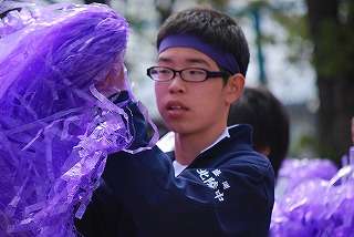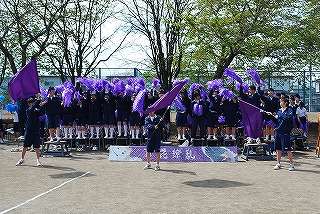 紫組団(1組団)の団長は、門脇 明日香さん。門脇 明日香さんのかけ声の下、紫組団(1組団)はまとまって応援に取り組みました。