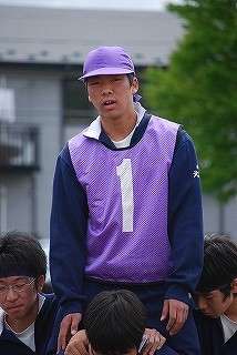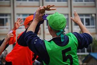 男子の騎馬戦は迫力満点でした。2組団(桃組団)と7組団(黄組団)と5組団(緑組団)の決勝戦は、見応えがありました。2組団(桃組団)が圧勝でした。