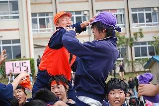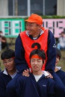 男子の騎馬戦は迫力満点でした。2組団(桃組団)と7組団(黄組団)と5組団(緑組団)の決勝戦は、見応えがありました。2組団(桃組団)が圧勝でした。