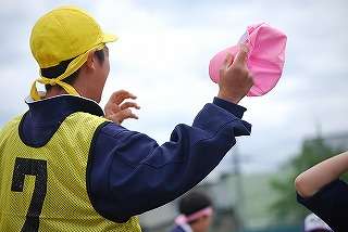 男子の騎馬戦は迫力満点でした。2組団(桃組団)と7組団(黄組団)と5組団(緑組団)の決勝戦は、見応えがありました。2組団(桃組団)が圧勝でした。