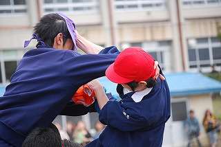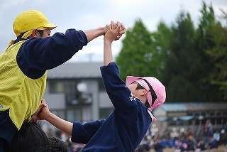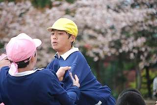 男子の騎馬戦は迫力満点でした。2組団(桃組団)と7組団(黄組団)と5組団(緑組団)の決勝戦は、見応えがありました。2組団(桃組団)が圧勝でした。