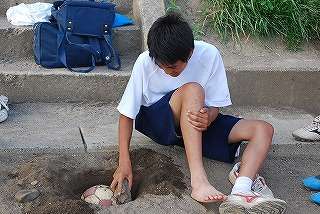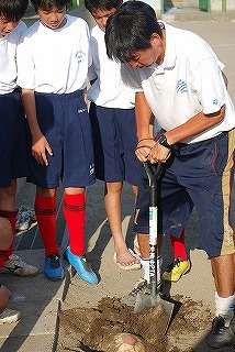 7月6日(火)久々にカメラを持って子どもたちの活動する部活動の様子を撮影に出かけました。自分の部活動を少し削って、校舎内や校庭を歩き回りました。とても暑い中県大会へ向けて練習中の「サッカー部」でした。顧問の先生の「檄」が飛んでいました。なにやら階段下の場所から何年か前に埋められた「サッカーボール」を発見し、「発掘調査をしています」と顧問の先生から教えられ、現場写真を「パチリ」。県中総体での優勝目指して頑張れ!サッカー部