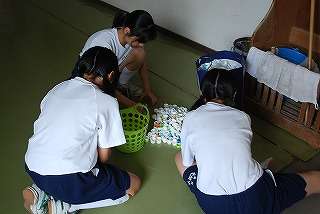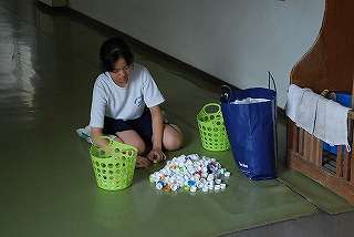 ※7月8日(水)の昼休み、ペットボトルキャップを集め数えている「SKET委員会」の様子です。