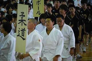 ※7月13日(火)県中総体の激励会の様子です。サッカー部、剣道部、柔道部、男子バレー部、バドミントン部、ハンドボール部、水泳部、陸上部、体操部、新体操部、男子卓球部が激励されました。また、吹奏楽部も同時に激励されました。