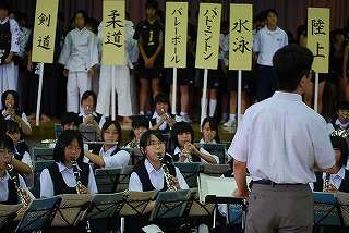 ※7月13日(火)県中総体の激励会の様子です。サッカー部、剣道部、柔道部、男子バレー部、バドミントン部、ハンドボール部、水泳部、陸上部、体操部、新体操部、男子卓球部が激励されました。また、吹奏楽部も同時に激励されました。