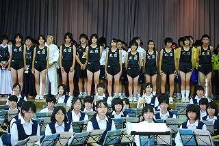 ※7月13日(火)県中総体の激励会の様子です。サッカー部、剣道部、柔道部、男子バレー部、バドミントン部、ハンドボール部、水泳部、陸上部、体操部、新体操部、男子卓球部が激励されました。また、吹奏楽部も同時に激励されました。