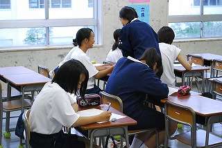 7月28日(水)の午前中、1年生も学習会に取り組んでいました。1学期の学習で不十分であった内容の学習会に取り組んでいました。生徒も大変ですが、先生も夏休み中ですが、「休めません」。1学期の学習内容の再確認です。部活動の合間を縫って学習に取り組みました。