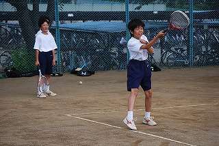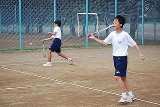 7月26日(月)夏休みに入りました。暑い日が続いています。生徒たちの元気な声が聞こえてきましたので、カメラを持って子どもたちの活動する部活動の様子を撮影に出かけました。暑い中でしたが、校舎内や校庭を歩き回りました。とても暑い中、市中新人大会へ向けて練習中の「男子ソフトテニス部」でした。