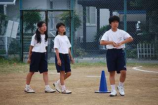 ※7月28日(水)ハンドボール部の活動の様子です。暑い中、男子も女子も顧問の先生の指導に従って、「パス回し」の練習中でした。1年生に何度も何度も繰り返し練習に取り組んでいる最中でした。