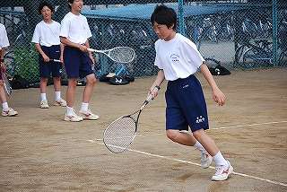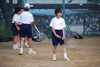 7月26日(月)夏休みに入りました。暑い日が続いています。生徒たちの元気な声が聞こえてきましたので、カメラを持って子どもたちの活動する部活動の様子を撮影に出かけました。暑い中でしたが、校舎内や校庭を歩き回りました。とても暑い中、市中新人大会へ向けて練習中の「男子ソフトテニス部」でした。