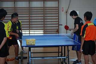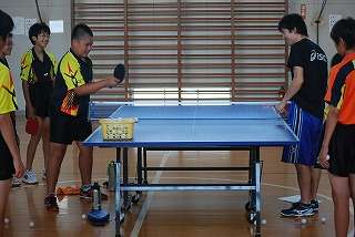 8月10日(火)この日も暑い日でした。最高気温が35度を超えるなか、土淵活動センターに「高橋先生」に来ていただき、卓球の指導をしていただきました。先週は「女子卓球部の指導」に来ていただき、今回は男子の部員に「県中新人大会ベスト4」を目指して技術指導をしていただきました。初めは「いかにタイミングを早く取りフォア打ち、ハーフボレーができるかどうか」「強烈なフォアハンドドライブを打つ方法」「フットワーク練習で気をつけること」「台上でのボール処理の方法」さらには、10分間の休憩時間にも、その休憩時間を惜しんで「サーブの出し方」「バックハンドドライブのかけ方」などを聞いたりしました。顧問2人以上に技術指導はわかりやすく、丁寧な指導で生徒も「たくさん教えて、自分の技術にしよう」と食いついて練習に参加しました。