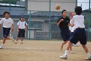 ※7月28日(水)ハンドボール部の活動の様子です。暑い中、男子も女子も顧問の先生の指導に従って、「パス回し」の練習中でした。1年生に何度も何度も繰り返し練習に取り組んでいる最中でした。