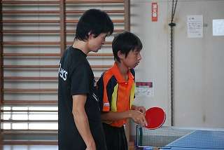 ※8月10日(火)「高橋先生」に来ていただき、卓球の指導を受ける生徒の様子です。高橋先生は矢巾北中出身で、水沢高校時代にインターハイへ出場した選手です。女子の顧問の先生の紹介で、今回の講習会を実現することができました。3時間も練習を見ていただき、指導をしていただきました。どの生徒もさらに「指導を受けたい」「また、教えてほしい」と話していました。あらたな練習への意欲づけになりました。また、機会を見つけて「県新人大会前」に指導を受けたいと考えています。