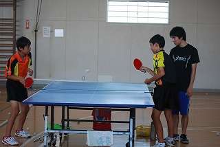 8月10日(火)この日も暑い日でした。最高気温が35度を超えるなか、土淵活動センターに「高橋先生」に来ていただき、卓球の指導をしていただきました。先週は「女子卓球部の指導」に来ていただき、今回は男子の部員に「県中新人大会ベスト4」を目指して技術指導をしていただきました。初めは「いかにタイミングを早く取りフォア打ち、ハーフボレーができるかどうか」「強烈なフォアハンドドライブを打つ方法」「フットワーク練習で気をつけること」「台上でのボール処理の方法」さらには、10分間の休憩時間にも、その休憩時間を惜しんで「サーブの出し方」「バックハンドドライブのかけ方」などを聞いたりしました。顧問2人以上に技術指導はわかりやすく、丁寧な指導で生徒も「たくさん教えて、自分の技術にしよう」と食いついて練習に参加しました。