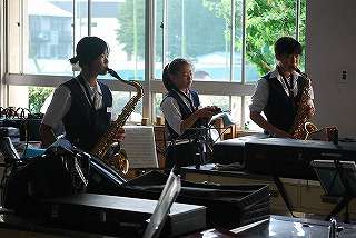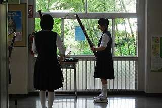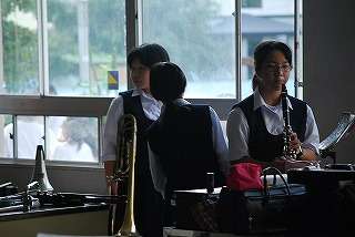 ※8月25日(水)吹奏楽部の朝練習の様子です。校庭からのぞける場所での練習の様子を撮影しました。