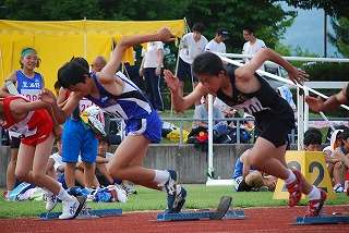 ※8月31日(火)雫石陸上競技場で行われた「盛岡市中学校陸上競技大会」の様子です。今回の大会は、全中大会100M優勝の「見前中の女子選手」を筆頭に全中大会200M第8位の小山選手など、岩手県代表として全国大会で活躍した選手がたくさん出場し、新聞記者やテレビ局の方も来て取材していました。200M女子決勝は「迫力ある」女子の戦いでした。「生」で見ることができ、感激です。