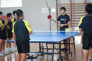 ※8月10日(火)「高橋先生」に来ていただき、卓球の指導を受ける生徒の様子です。高橋先生は矢巾北中出身で、水沢高校時代にインターハイへ出場した選手です。女子の顧問の先生の紹介で、今回の講習会を実現することができました。3時間も練習を見ていただき、指導をしていただきました。どの生徒もさらに「指導を受けたい」「また、教えてほしい」と話していました。あらたな練習への意欲づけになりました。また、機会を見つけて「県新人大会前」に指導を受けたいと考えています。
