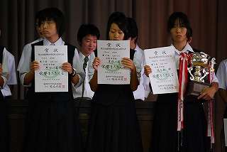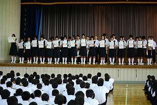 9月8日(水)の全校朝会の中で、「夏休み中の大会報告」が行われました。陸上部からは全国大会女子100M第8位の小山選手はじめ、市中陸上と市中駅伝競走大会の報告、水泳部からは市中水泳大会、県中水泳、東北水泳大会の報告、吹奏楽部の東北大会金賞、合唱部の岩手県大会金賞、男子卓球部の「盛岡市会長杯卓球大会優勝」等、夏休み中の大会の報告が行われました。