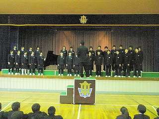 ※2日(火)の全校朝会で、北陵中学校を代表して連合音楽会に出場する「3年4組」の壮行合唱の様子です。