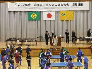 1回戦は陸前高田第一中(気仙地区第2代表)に、第1シングルスをとられるものの3−1で勝利しました。2回戦の相手は衣川中(胆江地区第2代表)にこれまた第1シングルスをとられましたが、3−1で勝利しました。衣川中とは1週間前の「胆江地区卓球大会」で対戦した学校でした。いよいよベスト4をかけての戦いは、猿沢中学校(一関地区第1代表、昨年度全国中学校大会ベスト8)でした。猿沢中学校には、個人戦の1位と2位の生徒がいますのでこの2人には歯が立ちません。ダブルスと残りのシングルス2つをとる以外に勝利できません。しかし、ダブルスも相手と競り合うものの、0−3で惜敗しました。また北陵中のエースの三又選手が、猿沢中の第1シングルスの相手に競りあうものの、0−3で敗退しました。結果1−3で猿沢中学校に勝つことができず、ベスト4の夢はお預けとなりました。残念です。しかし、2年生のおかげで北陵中学校を県中新人大会ベスト8に導いてくれました。北陵中学校卓球部としては、初めてのことです。