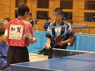 11月13日(土)滝沢村総合公園体育館で行われた「岩手県中学校新人大会卓球競技」で、2回戦で西根第一中の選手に3−0,3回戦吉里吉里中の選手に3−1で勝利し、ベスト16入りを果たしました。4回戦は萩荘中の選手との激戦となりました。この選手は花巻北中の選手(シード選手)に接戦の末勝ち上がってきた選手です。1セット取られ、2セット目を取り返し、3セット目を取られ、4セット目を取り返しての最終セット。5セット目も接戦となりました。5点を先に取りチェンジコート。10−9のマッチポイントを迎えました。お互いに気持ちの勝負となりました。「勝負あったか」と思いましたが、ここからジュースに持ち込まれ、11−13で惜敗しました。ベスト8まで手が届いていましたが、勝利の女神はほほえんでくれませんでした。卓球を始めてたった1年半でここまで上り詰めてきた北陵中学校の選手に拍手を送り、さらに上位を目指して練習に取り組んでくれることでしょう。