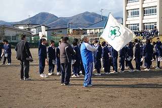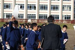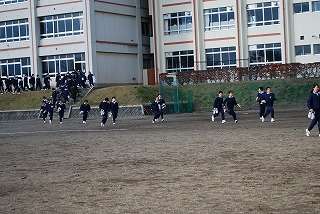 11月15日(月)、5校時に第2回目の避難訓練が行われました。今回は「地震発生」という状況を想定していました。「避難開始」の合図から全学級の避難終了の報告が完了するまで約6分30秒でした。校舎を出て、校庭を避難する時に走るべきところを歩いていたり、おしゃべりをしていた生徒たちも若干いましたが、全体的にはきちんと訓練に参加していました。訓練の終わりの会では、校長先生が2年前の地震のことなどに触れてこのような訓練の意義などについてお話をされました。