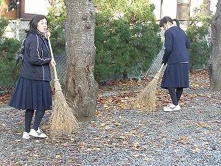 お〜寒い!寒い朝です。今朝の最低気温が−2度の寒い朝です。今朝はようやく7組の『落ち葉ボランティア』が出動しました。しかし、櫻の葉っぱはほとんど落ち、少なくなりました。7組は初めての登場ですが、7組の伊瀬さんと菅原さんは、毎日一番に来て、校長先生と一緒に落ち葉掃きを始めている生徒です。今日は、7組と1組が『落ち葉ボランティア』の活動をしてくれました。今日の活動は3年7組と1組の『落ち葉ボランティア』隊が出動し、体育館周りの落ち葉集めを頑張ってくれました。