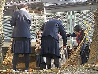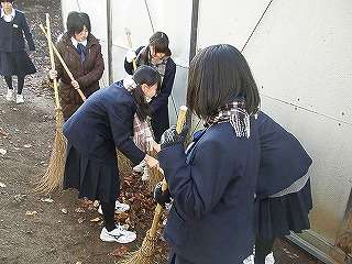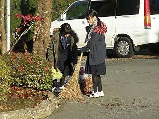 お〜寒い!寒い朝です。今朝の最低気温が−2度の寒い朝です。今朝はようやく7組の『落ち葉ボランティア』が出動しました。しかし、櫻の葉っぱはほとんど落ち、少なくなりました。7組は初めての登場ですが、7組の伊瀬さんと菅原さんは、毎日一番に来て、校長先生と一緒に落ち葉掃きを始めている生徒です。今日は、7組と1組が『落ち葉ボランティア』の活動をしてくれました。今日の活動は3年7組と1組の『落ち葉ボランティア』隊が出動し、体育館周りの落ち葉集めを頑張ってくれました。