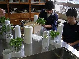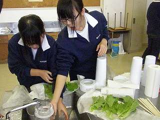 12月9日(木)の5校時、調理室から「元気のいい声、楽しそうな声」が聞こえたので、中を覗いてみました。3年5組が技術家庭の授業で育てた「レタス」を試食していました。レタスだけでは、と言うことで「ミートボール」を暖めて一緒に食べる準備をしていました。