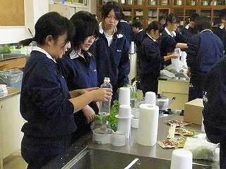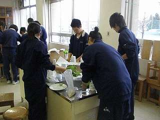 12月9日(木)の5校時、調理室から「元気のいい声、楽しそうな声」が聞こえたので、中を覗いてみました。3年5組が技術家庭の授業で育てた「レタス」を試食していました。レタスだけでは、と言うことで「ミートボール」を暖めて一緒に食べる準備をしていました。