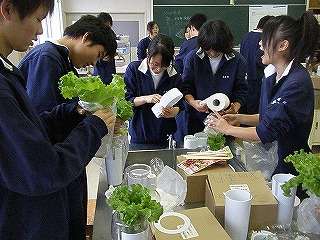 12月9日(木)の5校時、調理室から「元気のいい声、楽しそうな声」が聞こえたので、中を覗いてみました。3年5組が技術家庭の授業で育てた「レタス」を試食していました。レタスだけでは、と言うことで「ミートボール」を暖めて一緒に食べる準備をしていました。