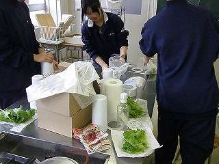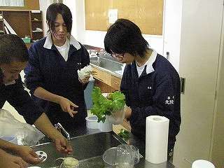 12月9日(木)の5校時、調理室から「元気のいい声、楽しそうな声」が聞こえたので、中を覗いてみました。3年5組が技術家庭の授業で育てた「レタス」を試食していました。レタスだけでは、と言うことで「ミートボール」を暖めて一緒に食べる準備をしていました。
