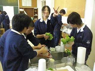 12月9日(木)の5校時、調理室から「元気のいい声、楽しそうな声」が聞こえたので、中を覗いてみました。3年5組が技術家庭の授業で育てた「レタス」を試食していました。レタスだけでは、と言うことで「ミートボール」を暖めて一緒に食べる準備をしていました。