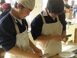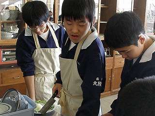 12月9日(木)の1校時、調理室から賑やかな声が聞こえてきたので、中に入っていきました。キュウリの輪切りや千切りなど切り方4種類とリンゴの皮むきの練習中でした。リンゴの皮むきをしているのを見ていると、「うまい!上手だ!」と言う男子、「え〜、それじゃあ手を切ってしまうよ」と思われる女子生徒など様々でした。