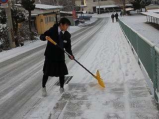 12月17日(金)前日から降り続いた雪のため、一面白くなりました。前日に「3年生の雪かきボランティア隊」を募集し、7組の「松平くん」が「朝早く来ます!」と言って帰って行ったので、私は雪かきのため「7時」に出勤しました。今日の雪かきボランティアは、3年7組の松平竜馬くんと菅原桃子さんが活動をしました。2人で、校舎周りの歩道の雪払いをしました。(2人とも月が丘から通学しています。雪のため自転車が使えませんので、たぶん6時30分には家を出たのでしょう。学校の雪かきのためだけに、いつもよりも30分以上早く家を出てきたのでしょう。そういう事に頑張れる人が本当のボランティアの活動なのでしょう。)「雪かき」が必要なのかどうなのかは、一人一人の判断になります。「自覚」を持って参加しましょう。