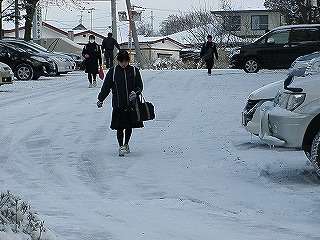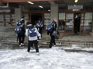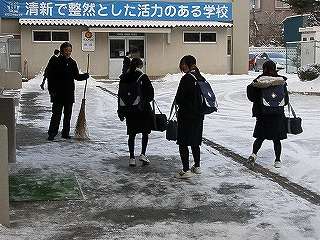 雪が積もった17日(金)の朝、校長先生も「竹ほうき」片手に、登校指導です。