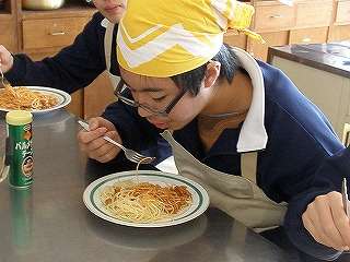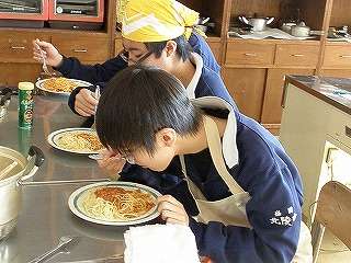 12月17日(金)の1,2校時、調理室前の廊下を通過すると「いい匂い」がしてきました。私の授業がありませんので、カメラを持って調理室にお邪魔しました。今度は2年4組さんが「スパゲッティミートソース」の調理実習をしていました。試食までさせていただきました。今回は調理しているところは撮影できませんでしたが、試食しているところを撮影させていただきました。