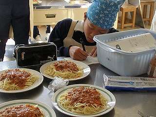 廊下にいい匂い「スパゲッティミートソース」作り☆2年4組が調理実習(その2)