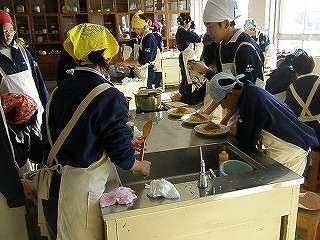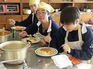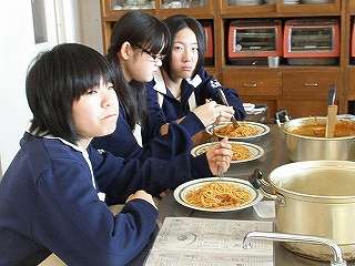 12月17日(金)の1,2校時、調理室前の廊下を通過すると「いい匂い」がしてきました。私の授業がありませんので、カメラを持って調理室にお邪魔しました。今度は2年4組さんが「スパゲッティミートソース」の調理実習をしていました。試食までさせていただきました。今回は調理しているところは撮影できませんでしたが、試食しているところを撮影させていただきました。