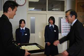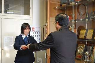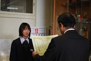 12月20日(月)、税の書写コンクールの表彰のため盛岡税務署の方々が来校されました。表彰されたのは2年5組の川戸志保さんと、1年3組の高橋夏美さんの2名です。校長室での表彰の様子です。