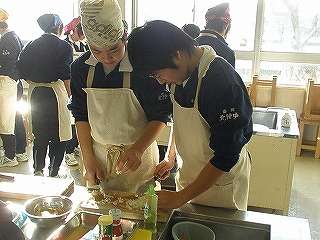 12月16日(木)の1,2校時、調理室前の廊下を通過すると「いい匂い」がしてきました。私の授業がありませんので、カメラを持って調理室にお邪魔しました。今度は2年5組さんが「スパゲッティミートソース」の調理実習をしていました。試食までさせていただきました。今回は調理しているところは撮影できませんでしたが、試食しているところを撮影させていただきました。