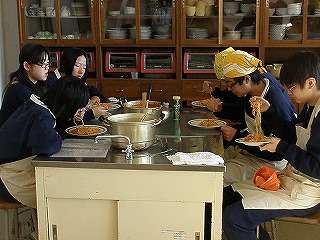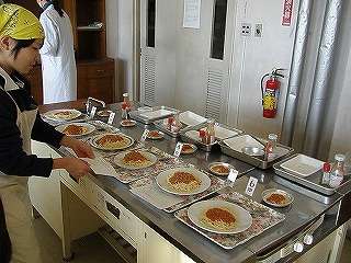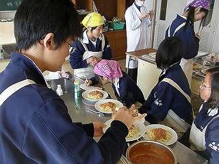 12月17日(金)の1,2校時、調理室前の廊下を通過すると「いい匂い」がしてきました。私の授業がありませんので、カメラを持って調理室にお邪魔しました。今度は2年4組さんが「スパゲッティミートソース」の調理実習をしていました。試食までさせていただきました。今回は調理しているところは撮影できませんでしたが、試食しているところを撮影させていただきました。