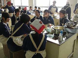 12月24日(金)の1、2校時、調理室前の廊下を通過すると「いい匂い」がしてきました。今日は2年3組さんが「スパゲッティミートソース」の調理実習をしていました。2校時は授業がありませんでしたので、試食の様子を撮影することができました。最後の学級です。食べる人は1回ですが、担当の高橋先生は6回試食します。結構大変です。今回は調理しているところは撮影できませんでした。